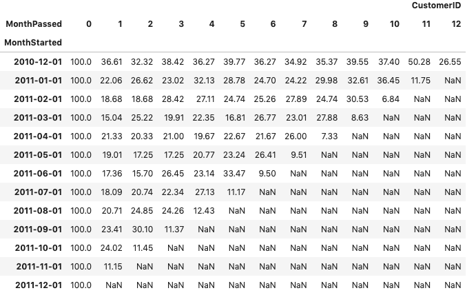오...!! 피벗 테이블로 나타내니까 코호트 차트와 굉장히 유사한 데이터 프레임이 생성되었다. !!!