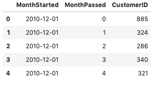 retail['MonthPassed']=(retail['Month'].dt.year - retail['MonthStarted'].dt.year)*12 + \