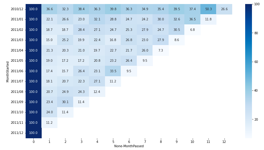 cus_cohort=cohort.div(cohort.iloc[:,0], axis=0)*100