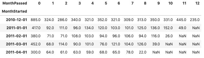 cohort = retail.groupby(['MonthStarted', 'MonthPassed'])['CustomerID'].apply(get_unique)