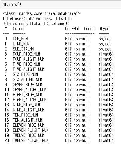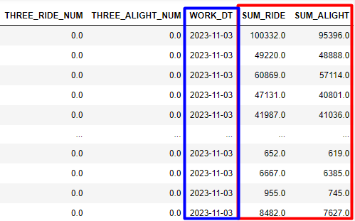 df = df[['USE_MON', 'LINE_NUM', 'SUB_STA_NM', 'FOUR_RIDE_NUM', 'FOUR_ALIGHT_NUM' ,'SUM_RIDE', 'SUM_ALIGHT']]