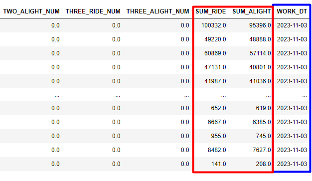 ex_a : ['USE_MON', 'LINE_NUM', 'SUB_STA_NM', 'FOUR_RIDE_NUM', 'FOUR_ALIGHT_NUM', ... 'THREE_RIDE_NUM', 'THREE_ALIGHT_NUM', 'SUM_RIDE', 'SUM_ALIGHT']