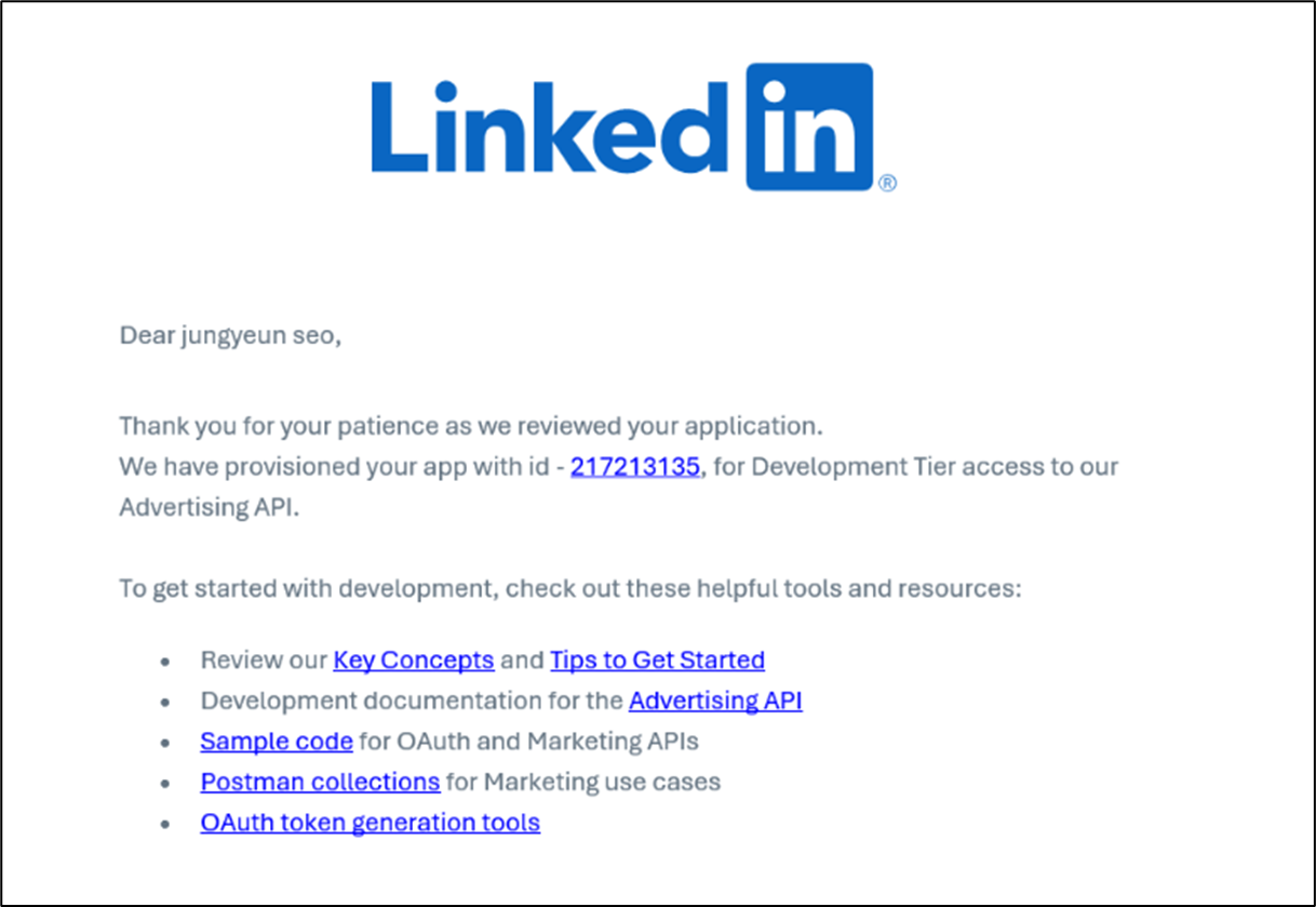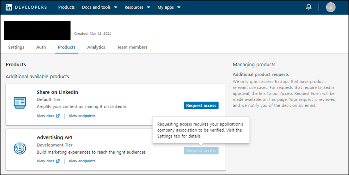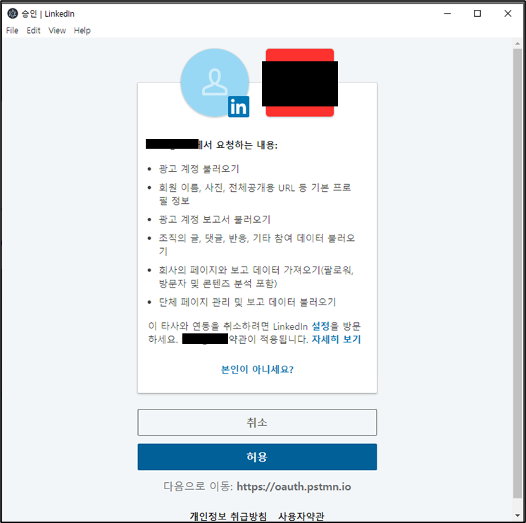 앱을 생성하면서 넣어주었던 회사의 LinkedIn 계정 담당자가 승인을 해주어야 API를 요청할 수 있다.