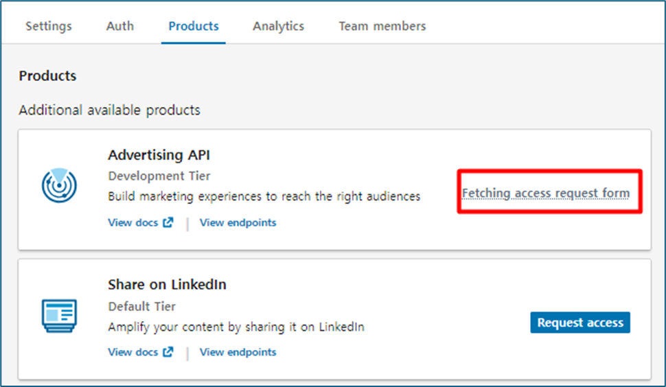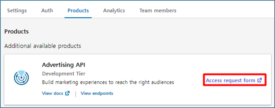 회사와 연결이 되면 [제품] 탭으로 가서 Advertising API에 대해 권한을 요청한다.