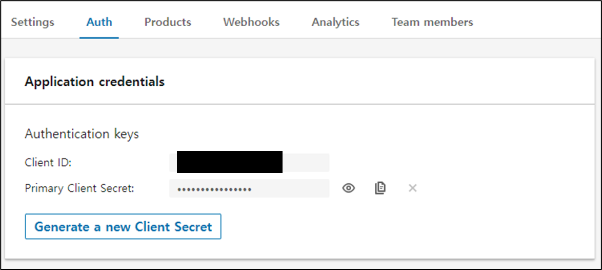 - Client ID = {Copy this from the “Auth” tab in the developer portal}