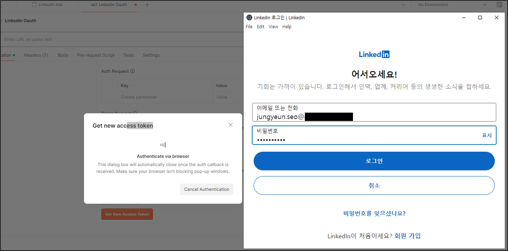 토큰을 생성하면 browser에서 잠시 확인을 하고 다음과 같은 LinkedIn 팝업이 뜬다.