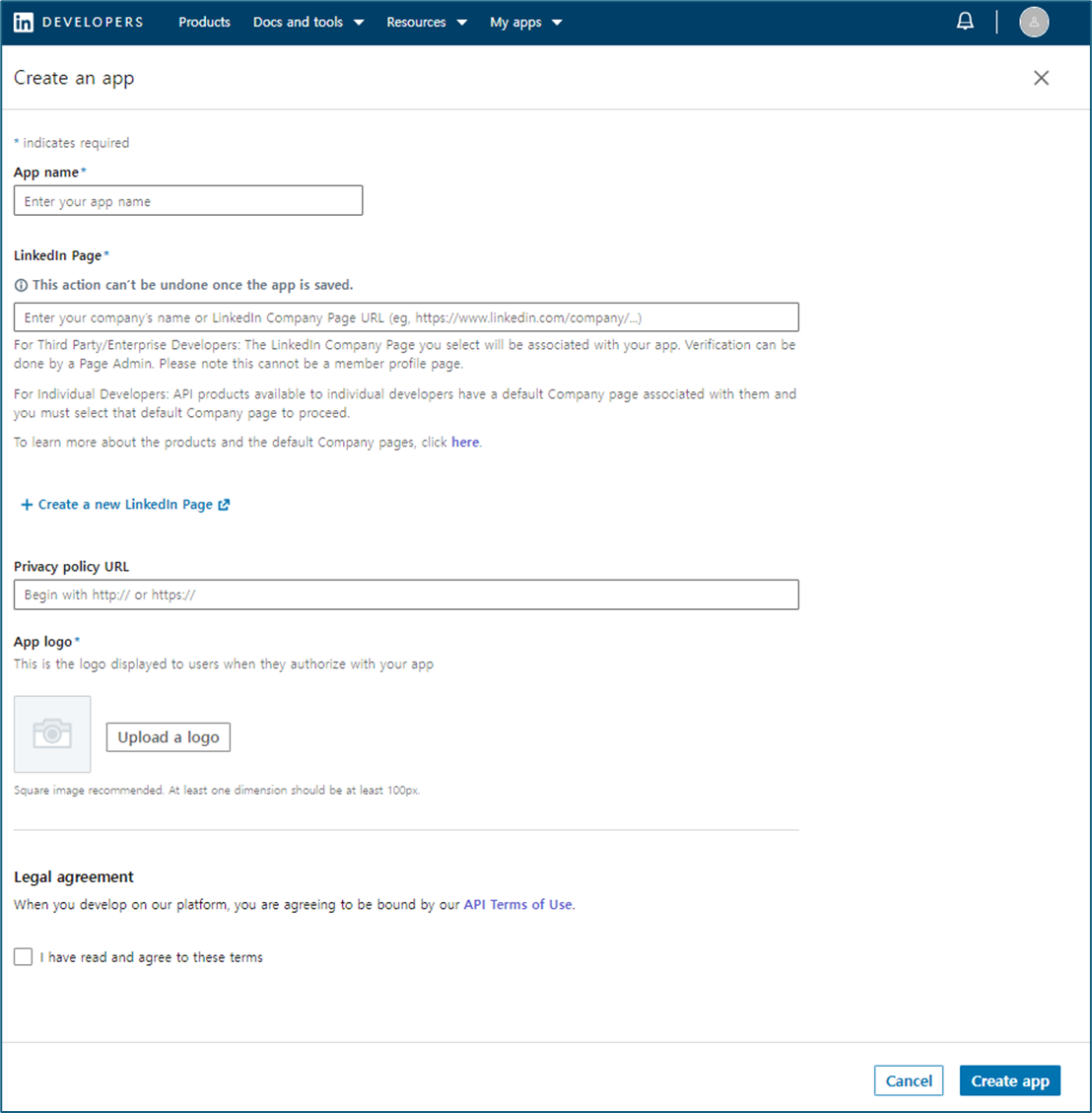 앱의 이름과 LinkedIn Page, 그리고 로고 이미지를 넣고 앱을 생성하면 된다.