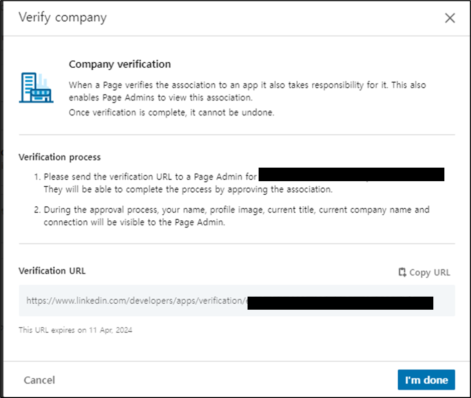 Verification URL 에서 URL 생성을 클릭해주면 URL이 생성이 되고 이를 복사해서 LinkedIn 계정 담당자에게 전달을 하면 된다.