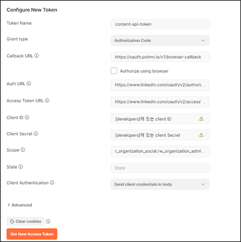 새로운 토큰을 생성해야 하는데 토큰 생성 관련 정보를 아래와 같이 입력해주고 Get New Access Token을 클릭해준다.