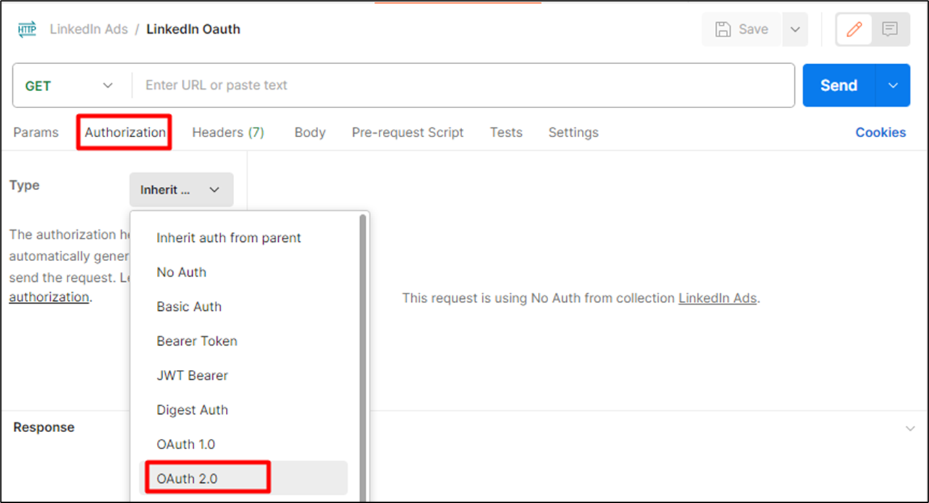 이제 Postman을 열고 Auth 탭으로 이동하고 Type을 OAuth 2.0으로 변경해준다.