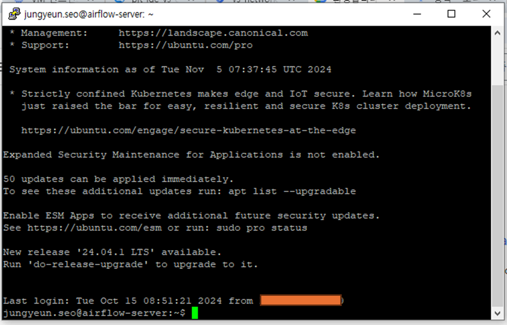 위 명령어로 SSH 연결이 성공하면 로컬 머신의 터미널에서 GCP 인스턴스에 접근할 수 있게 된다.