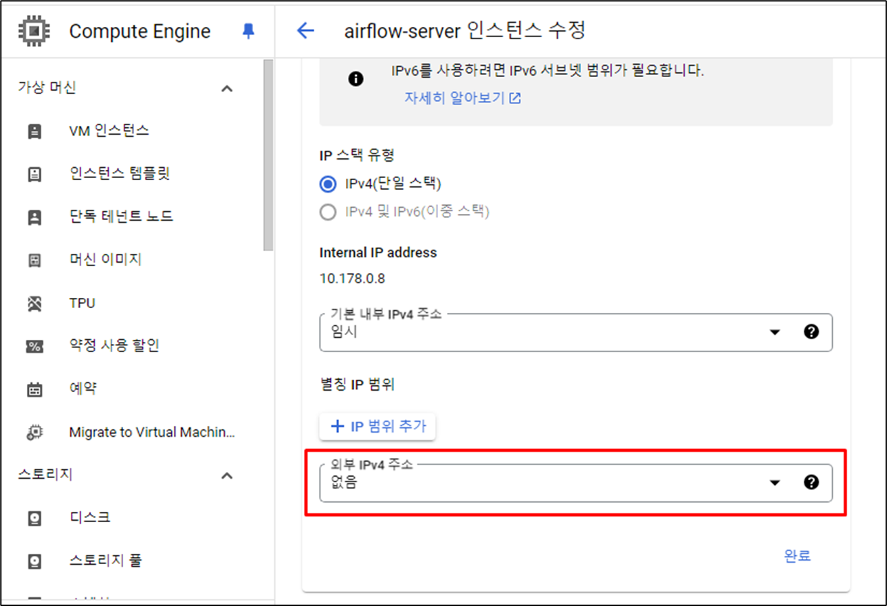 여기에서 외부 Ipv4 주소를 없음으로 변경해준다.