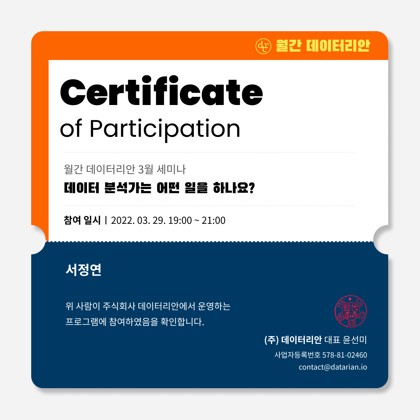 그리고 다 들으면 이렇게 참여증도 주시는데 완전 만족!!!! 오늘 받아서 블로그에 자랑하려고 신청을 했당