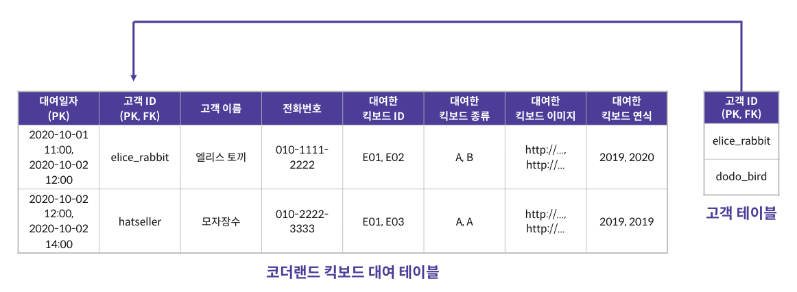 고객 이름과 전화번호는 고객의 ID 에 종속되어 있음 이 두 속성을 대여 테이블로부터 분리시켜 종속성을 제거